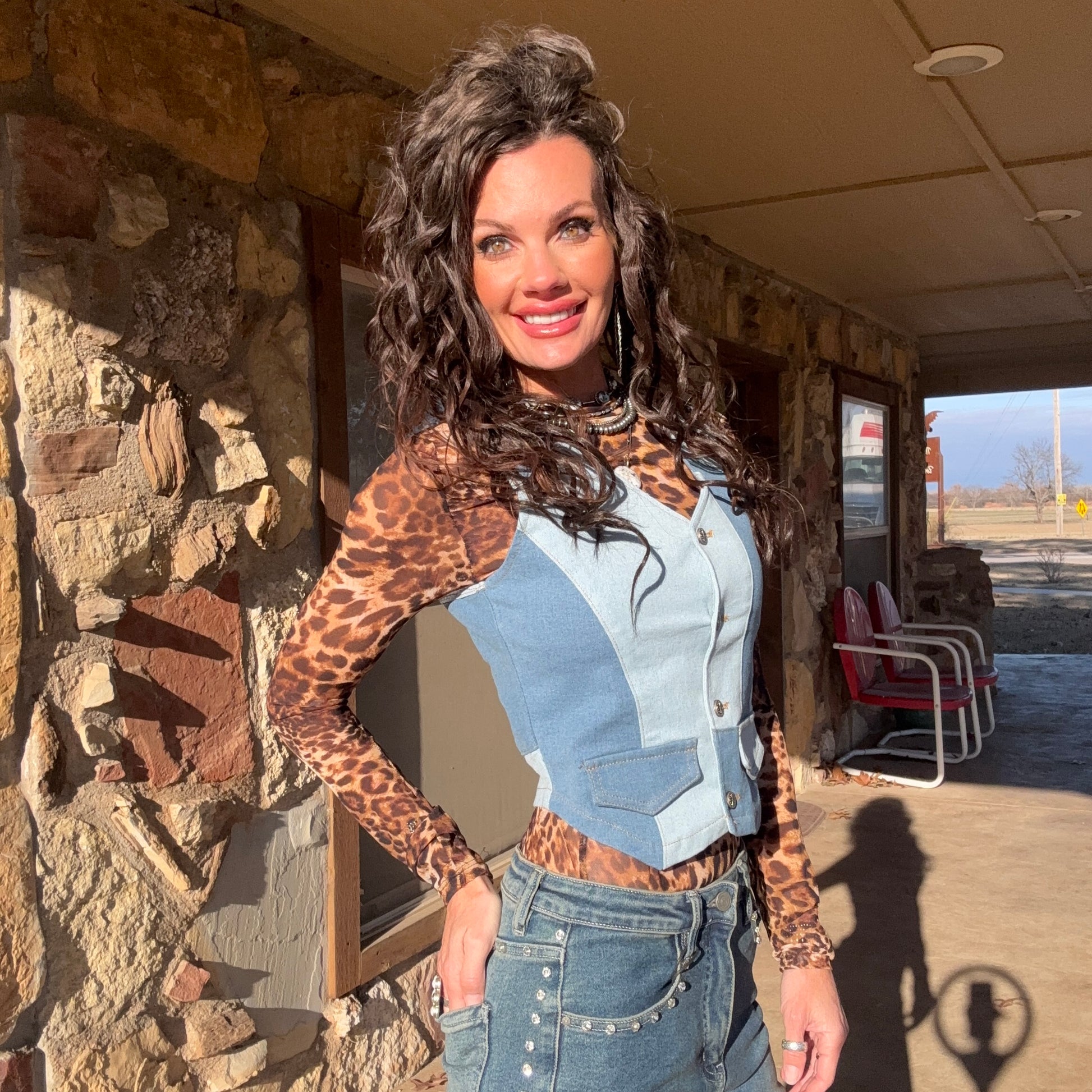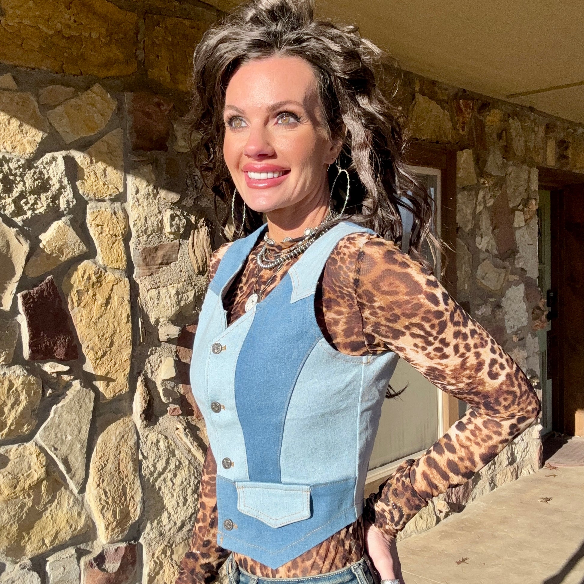 This denim patchwork vest is a true Western staple with a modern twist. Crafted from mixed-wash denim panels, it features a flattering tailored fit, a V-neckline, and antique-style button closures down the front. The structured seams and subtle contrast stitching create a vintage ranch-ready look, while the cropped length makes it perfect for layering over tees, blouses, or dresses. Finished with faux front pockets for added Western charm, this vest is an effortless way to add cowgirl character to any outfit.