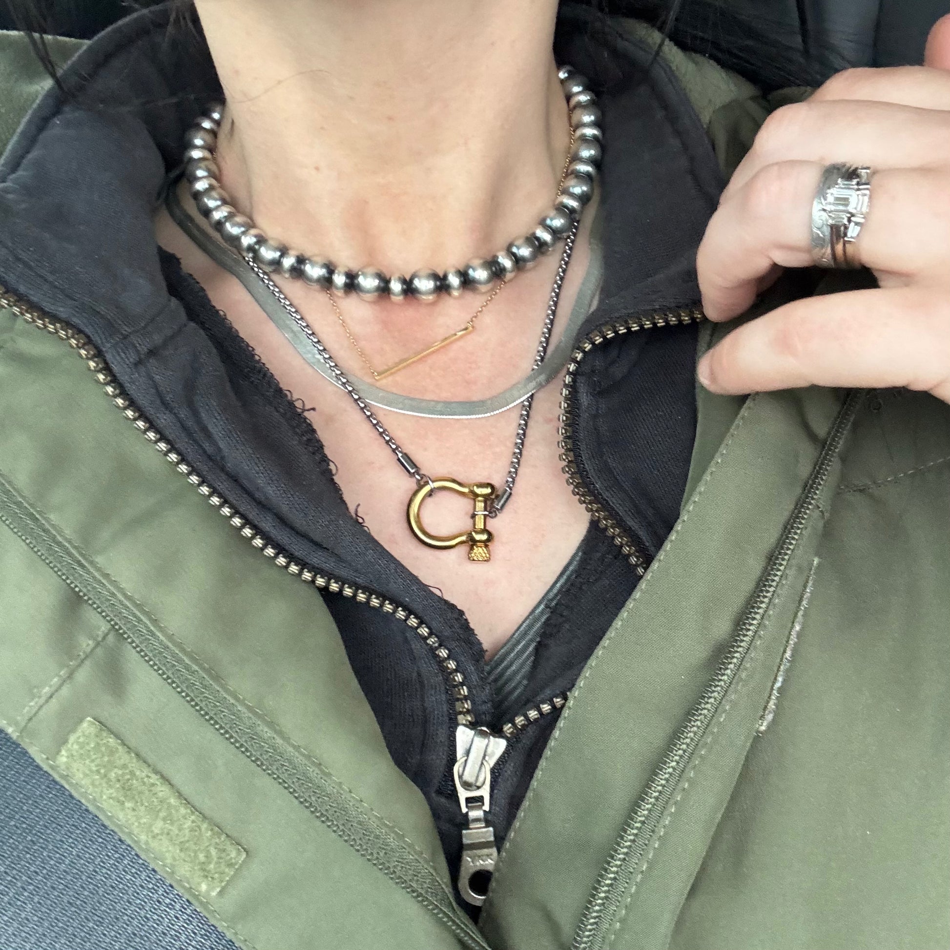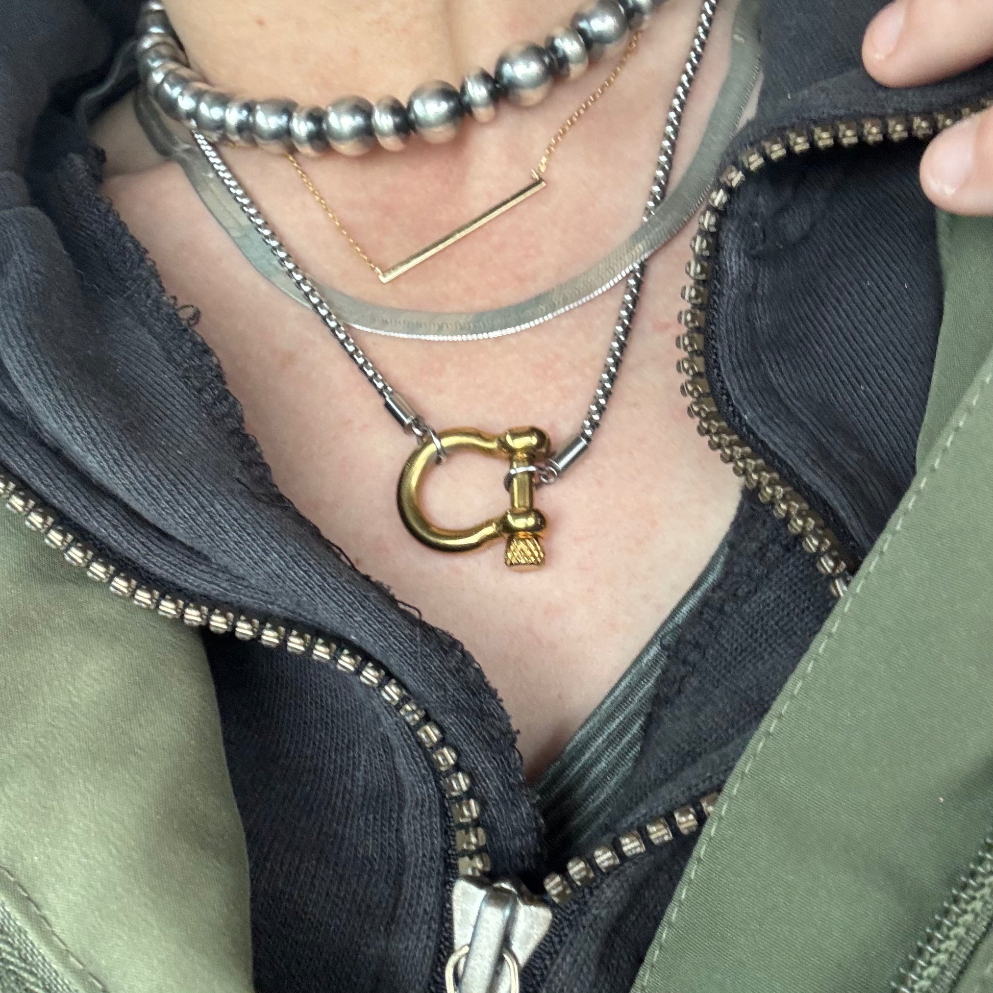 Where industrial grit meets modern edge. This 18” rhodium chain features a functional gold-plated clevis that screws to secure—serving as both the clasp and the bold centerpiece. It’s a statement piece that fuses utility with elevated style, perfect for stacking or standing solo.
