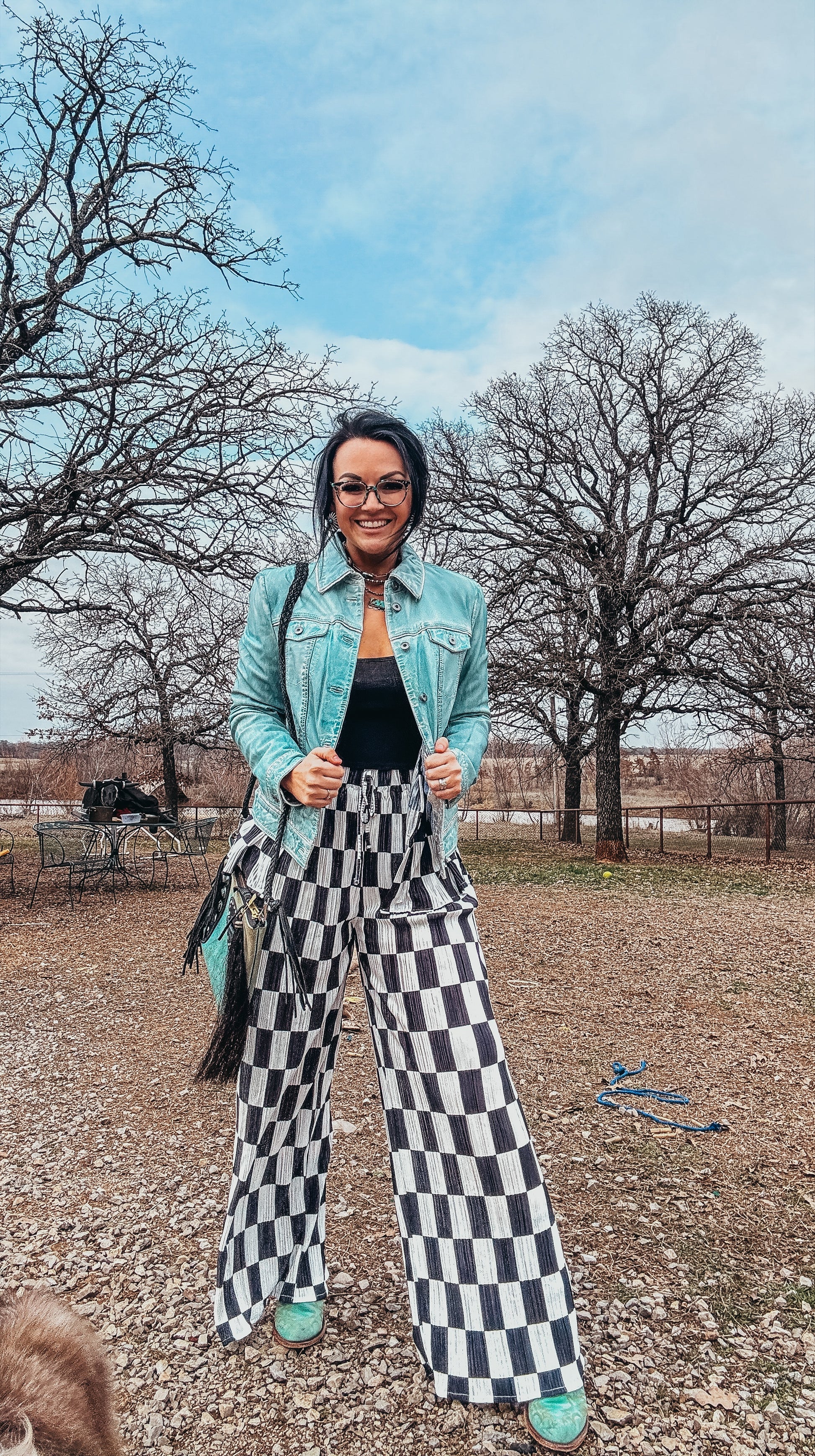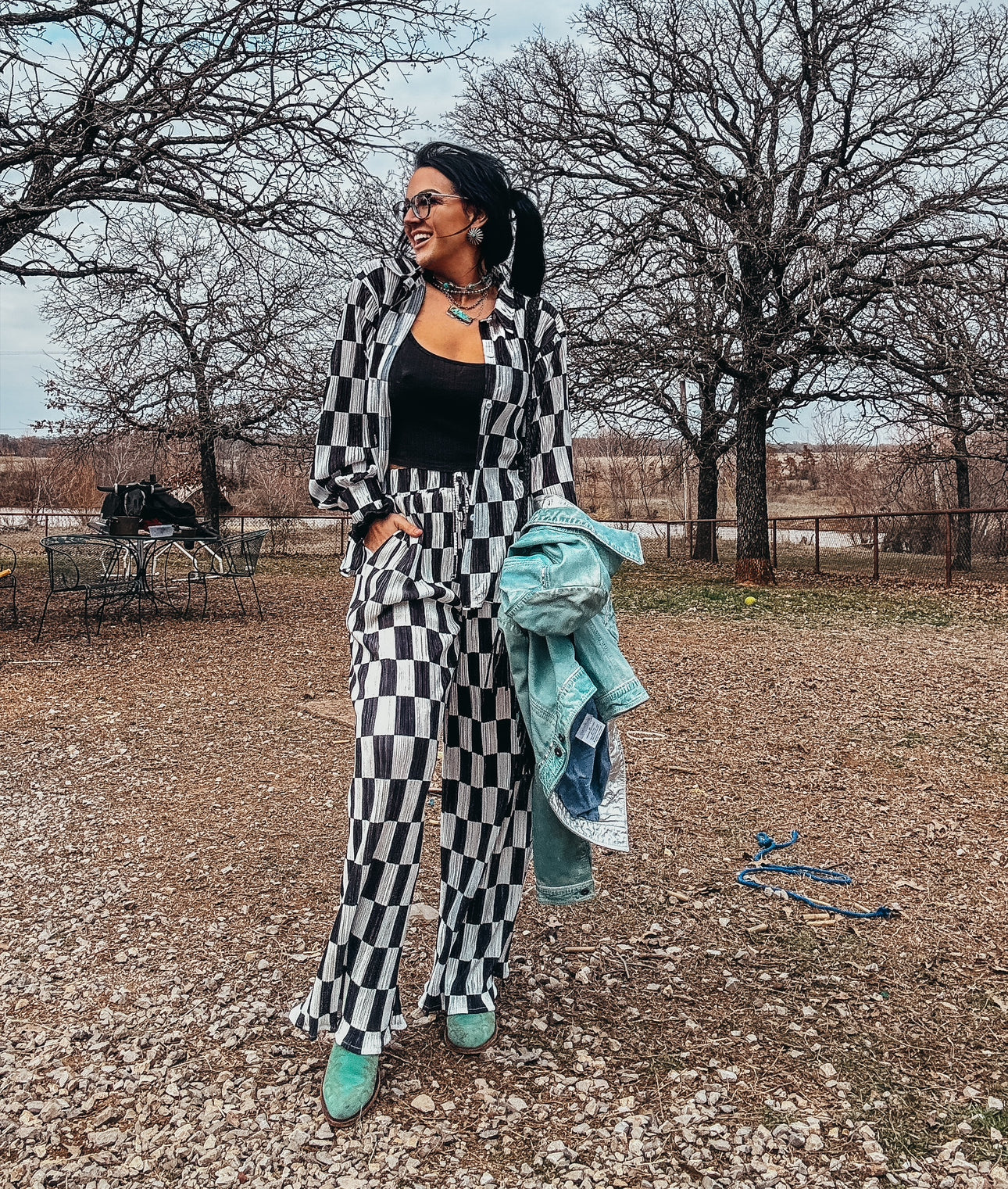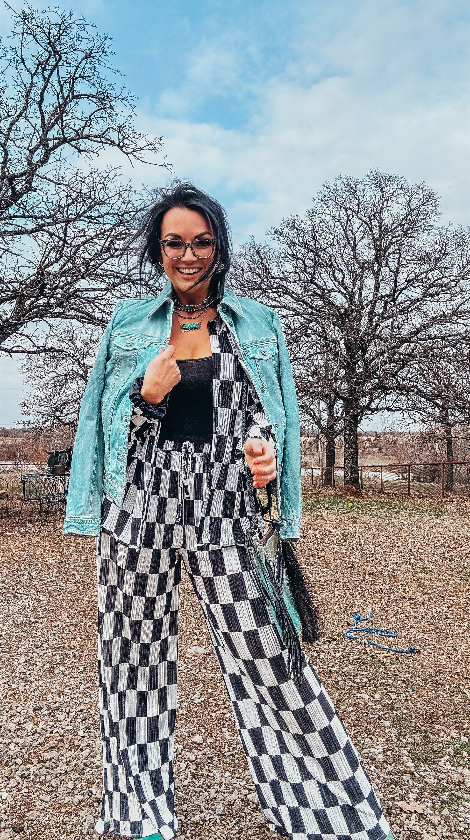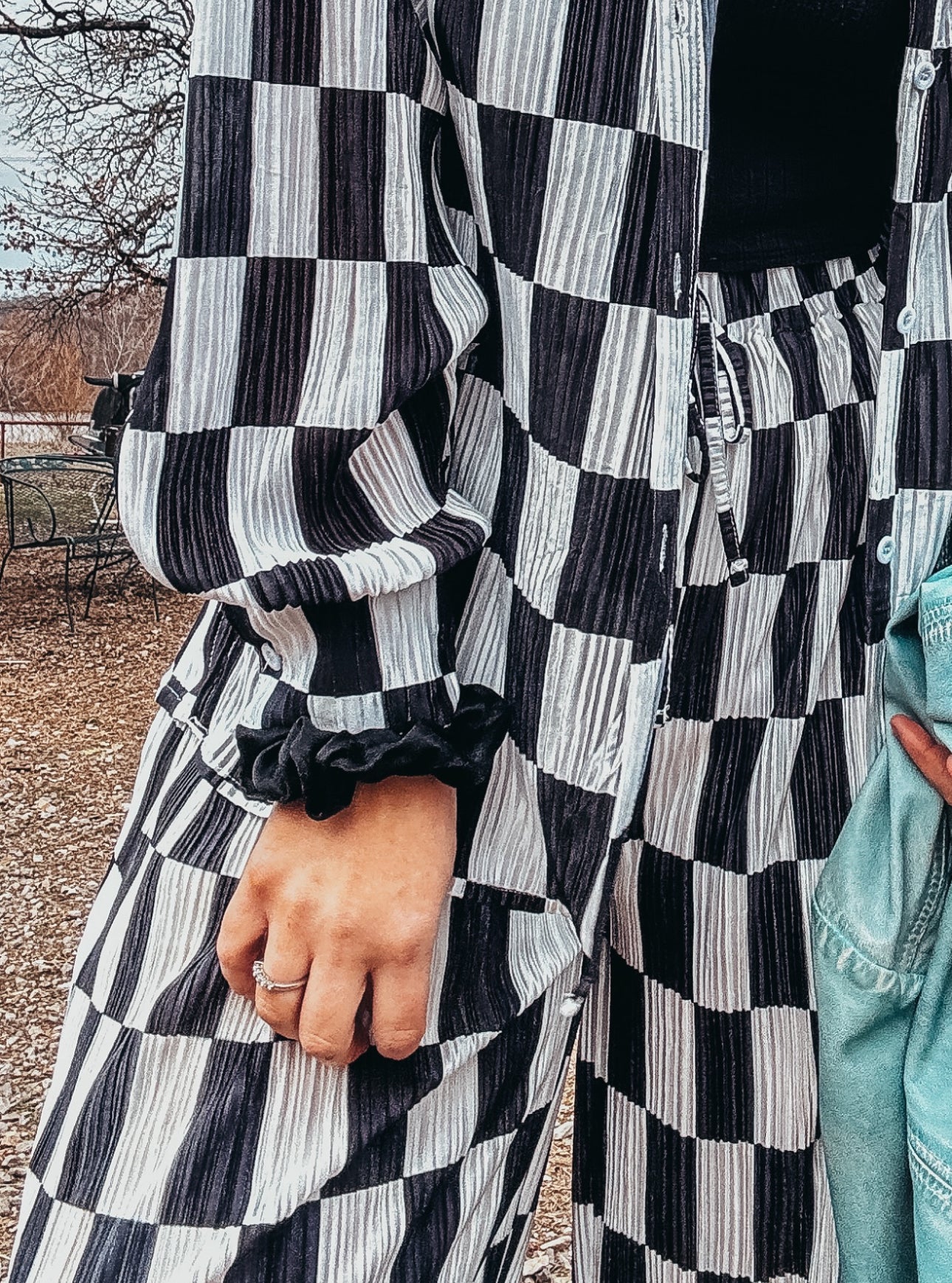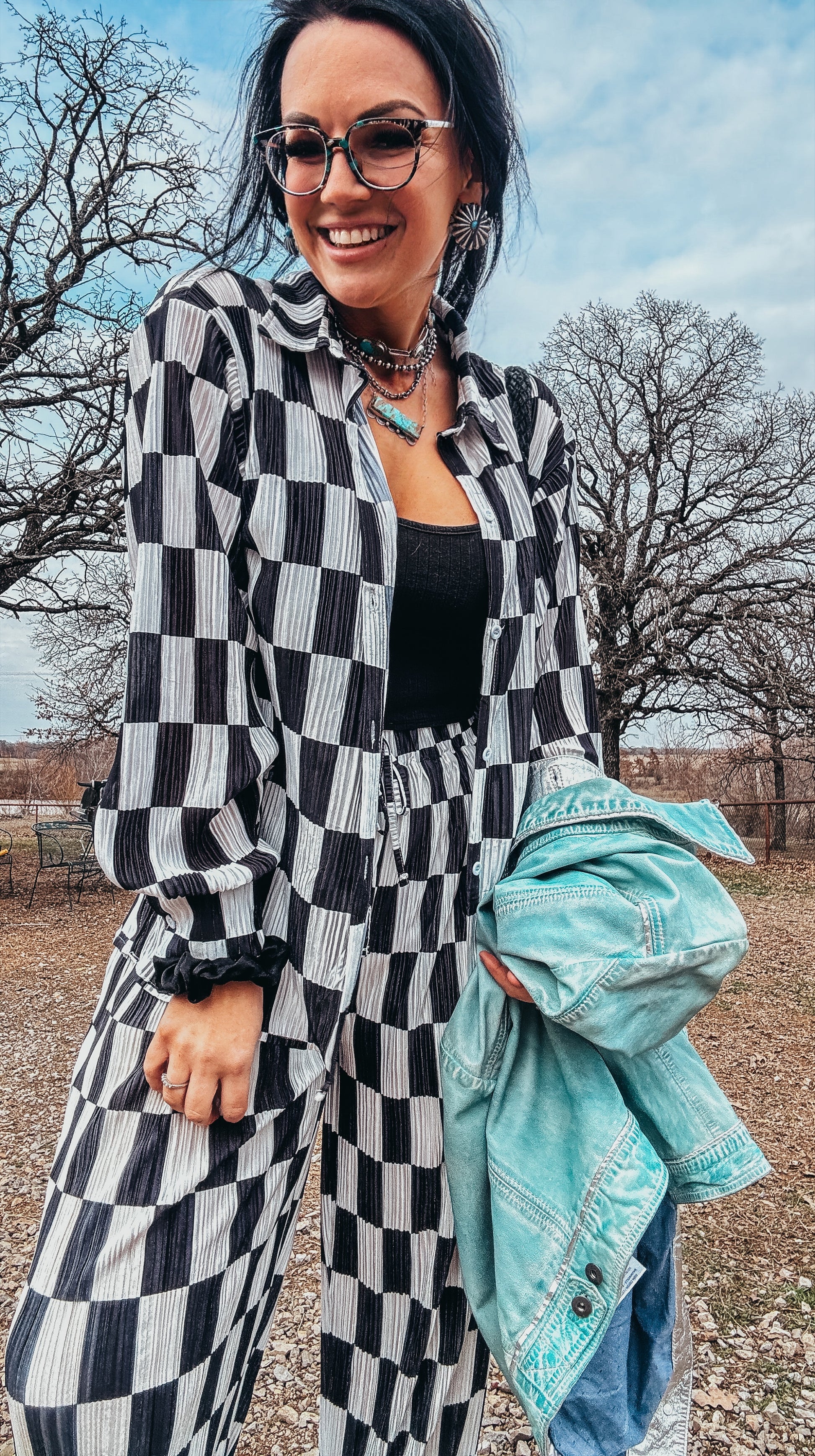 The Danika Plisse Pleated Checker Print Button Up Shirt Pants Set