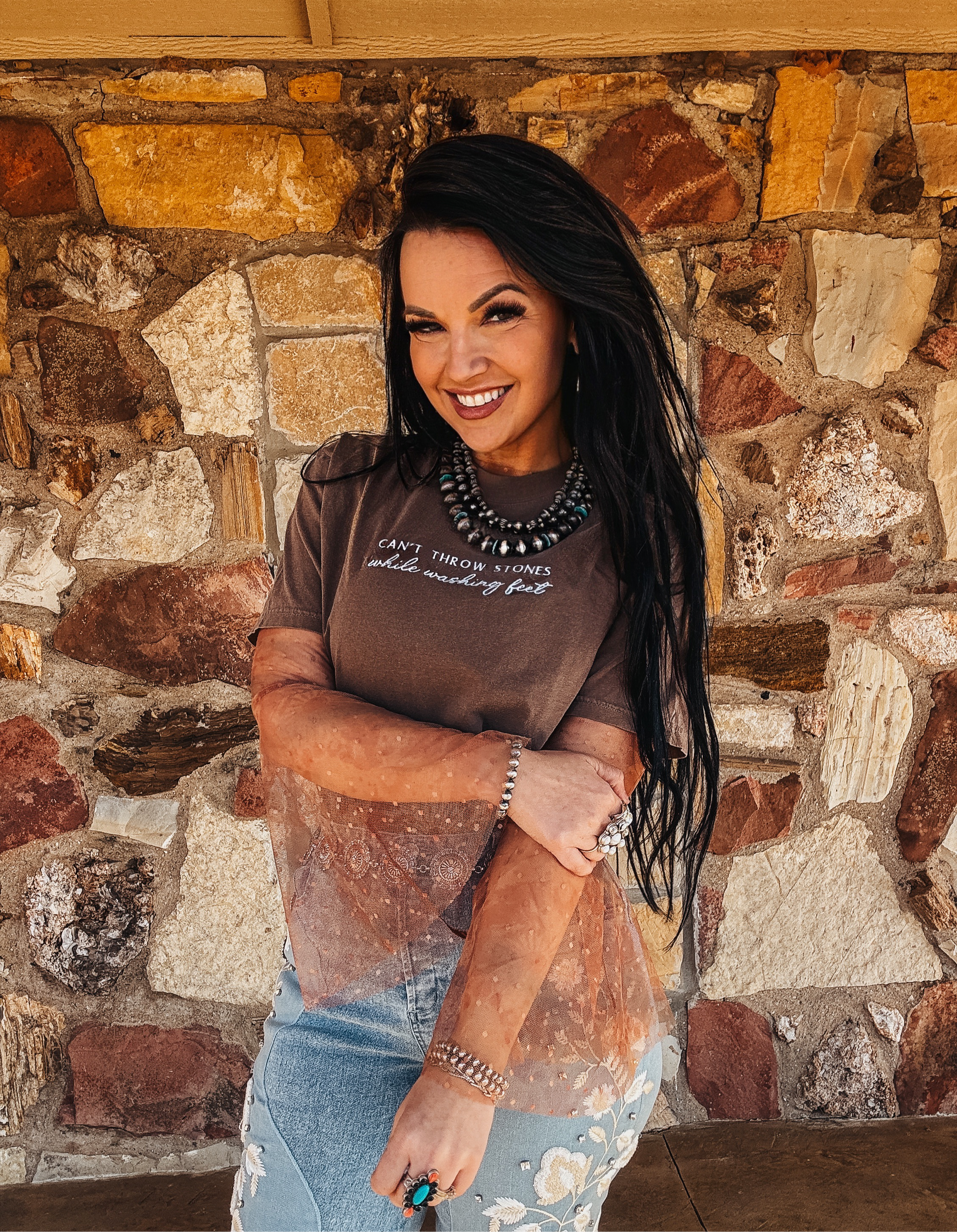 Dress this under your favorite graphic tee or wear over your favorite tank! Rust colored with a multi colored floral design (very minimal, fun detail I didn't even notice until I put it on!) This top fits snug and I would recommend sizing up! Me and Traci are both wearing a size small, but I would def need the medium if I was wearing!