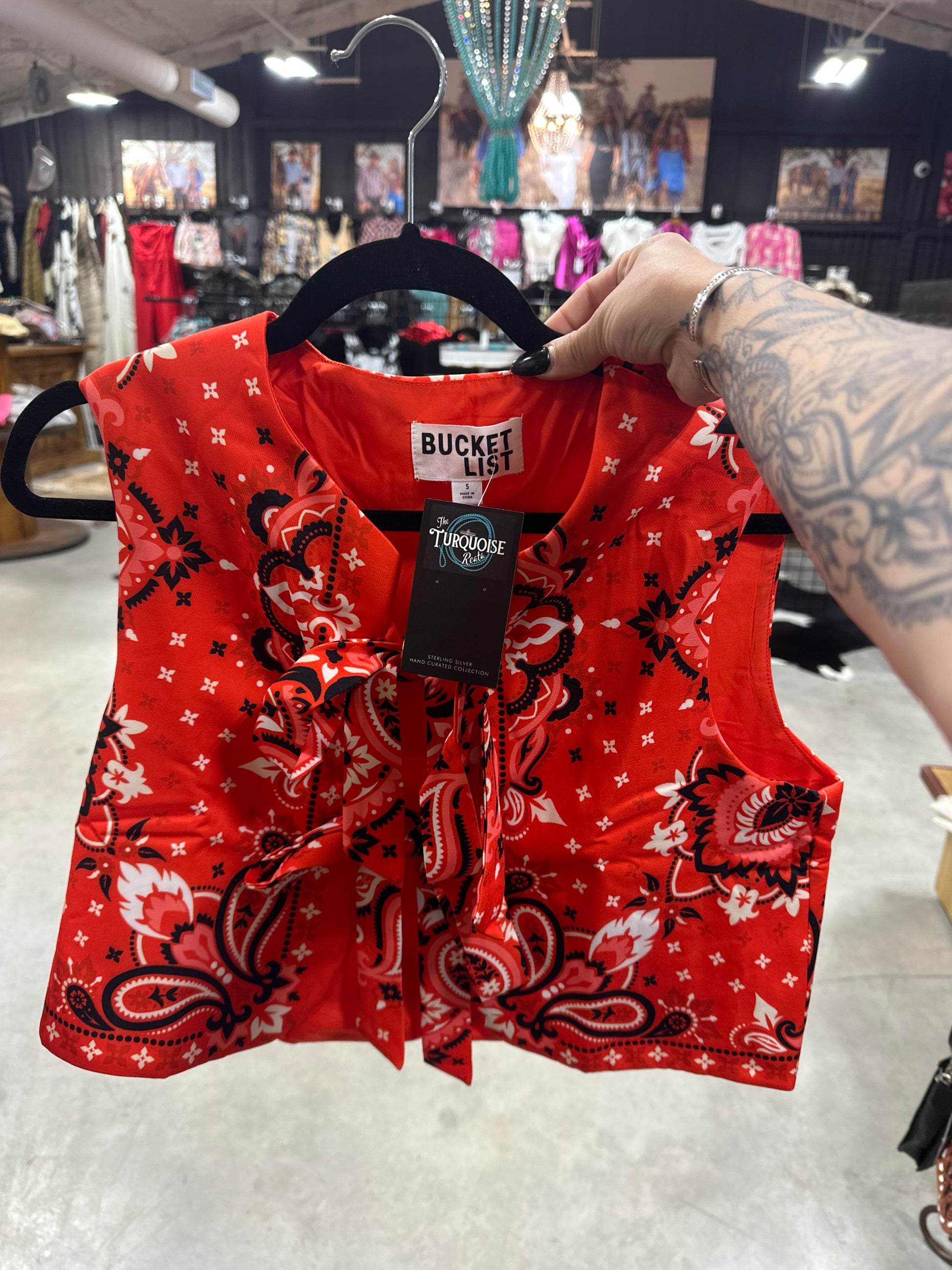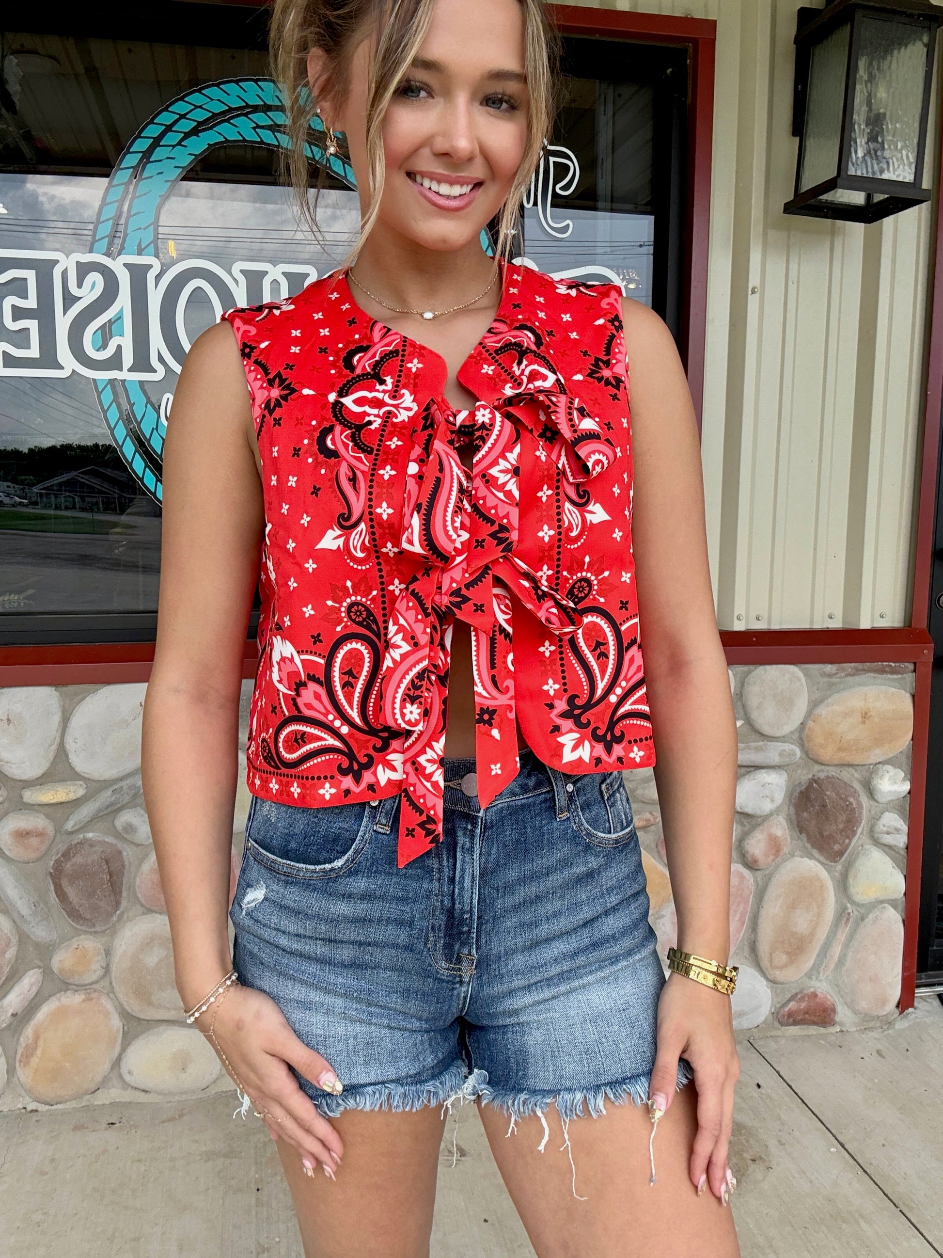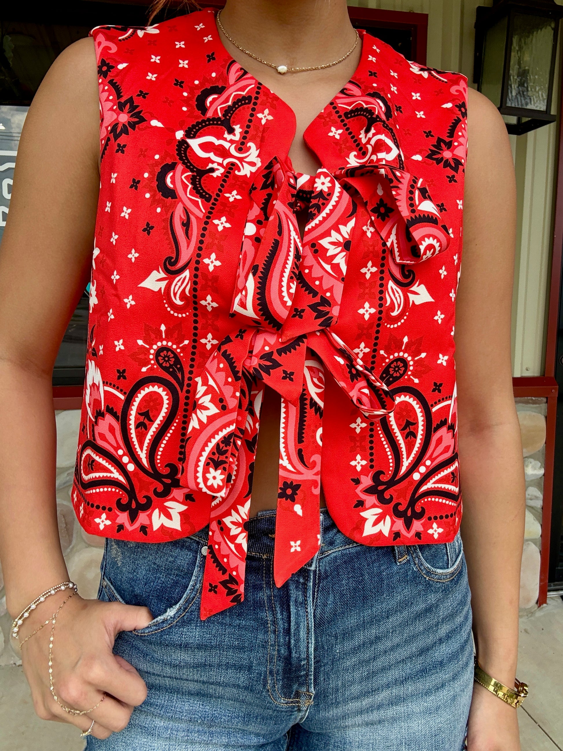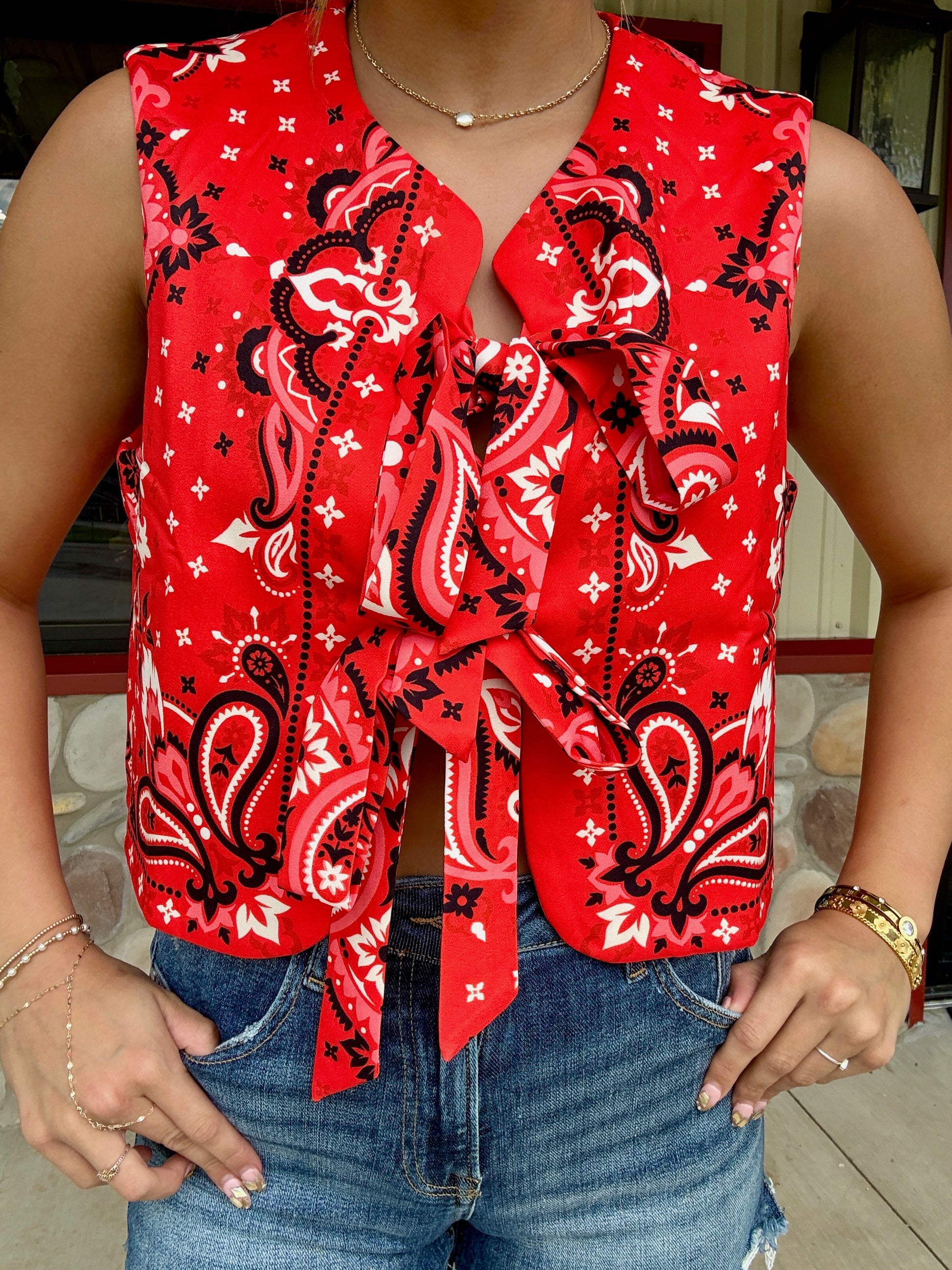 Saddle up and turn heads in The Red Dirt Rodeo Vest—a bold bandana print top that screams cowgirl cool with a flirty twist. This tie-front vest is the ultimate statement piece for rodeos, concerts, and summer nights that end with dancing under the stars.