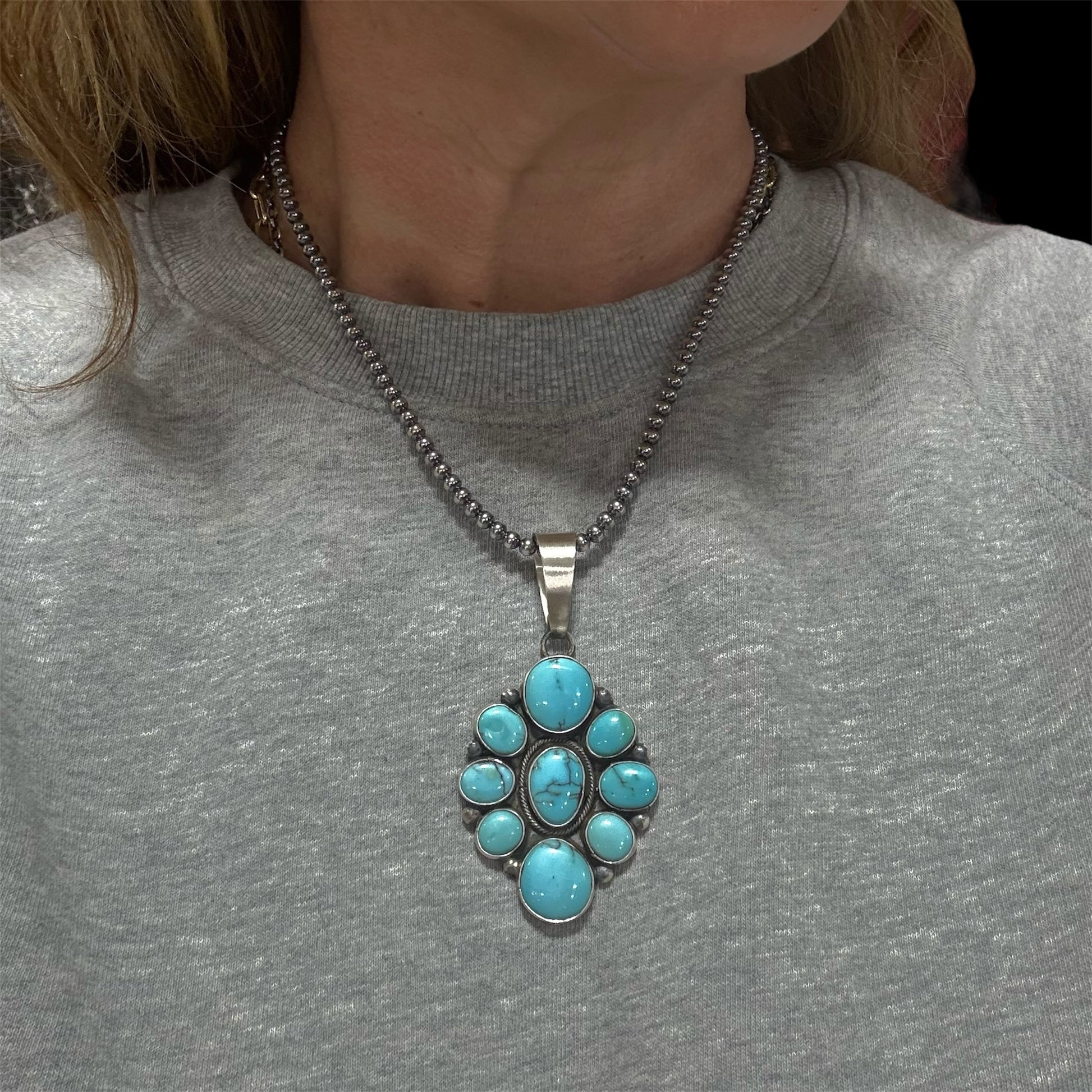 This striking pendant showcases a cluster of vibrant turquoise cabochons in varying shapes and sizes, each hand-set in smooth sterling silver bezels. The natural matrix in some of the stones adds depth and character, while the rich blue tones make this a true statement piece.