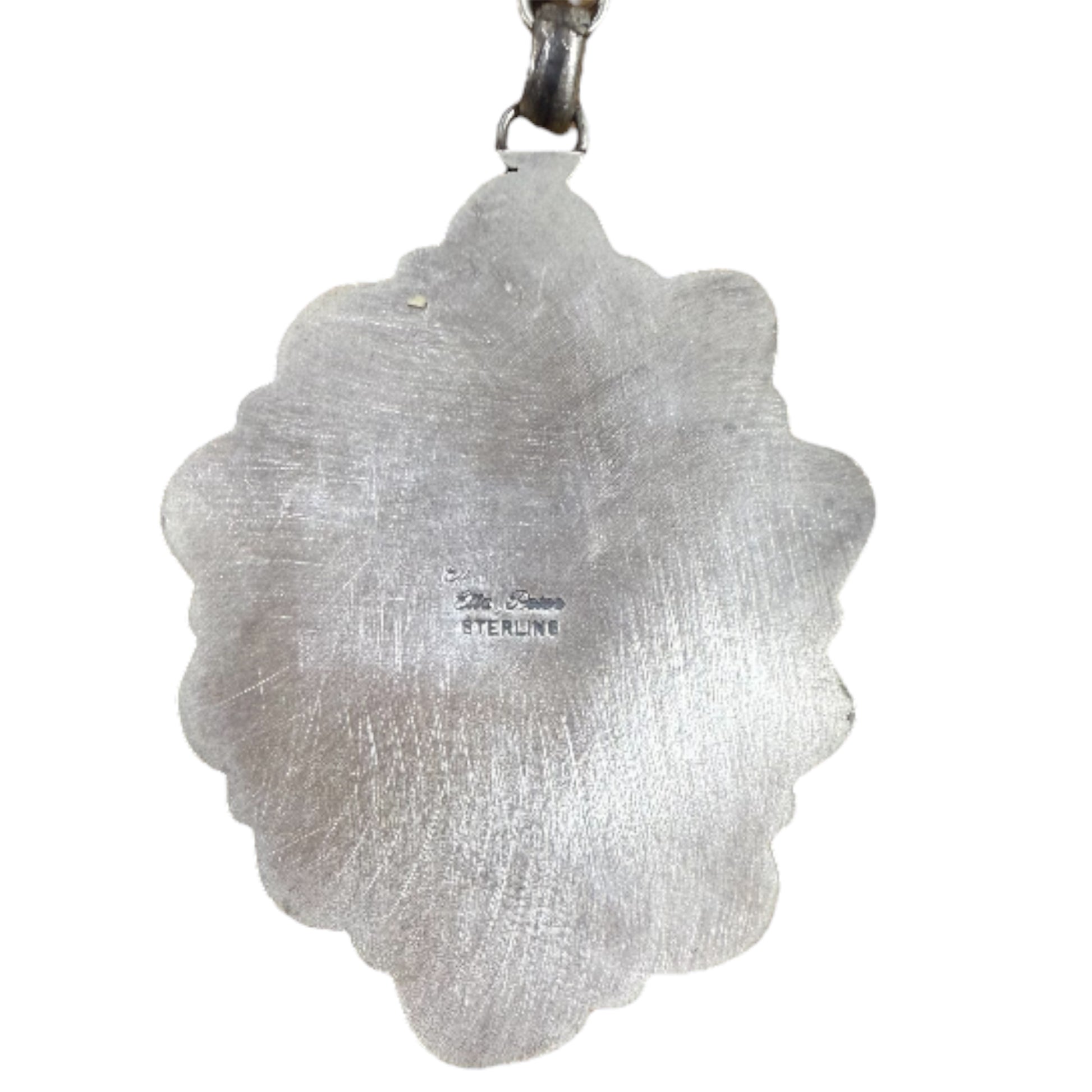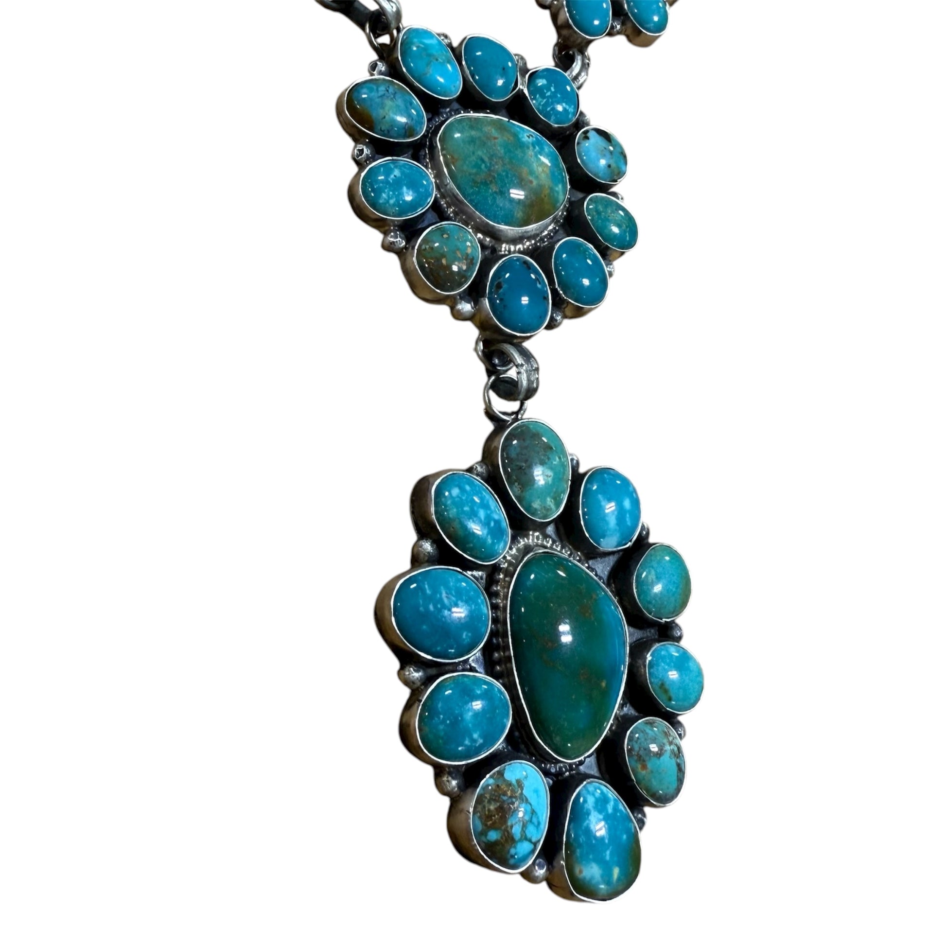Handcrafted turquoise cluster necklace by Ella Peters. Designed with vibrant, natural turquoise stones in rich shades of blue and green, each stone is hand-set in classic sterling silver. The floral cluster design cascades beautifully down the neckline, creating a striking statement piece that celebrates timeless Navajo craftsmanship.