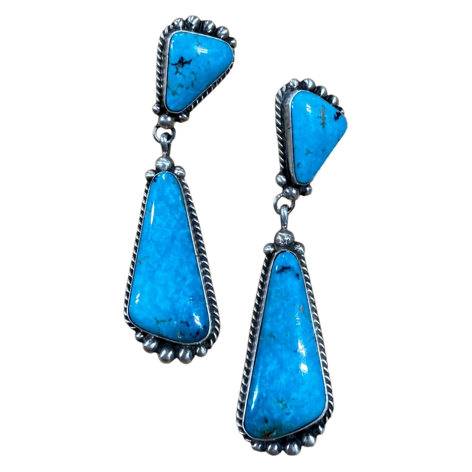 Exquisite handcrafted turquoise drop earrings by Navajo artisan Elouise Kee. Each earring features two striking natural turquoise stones—one at the stud and a larger trapezoid-shaped drop below—framed in sterling silver with classic Navajo rope and bead detailing.