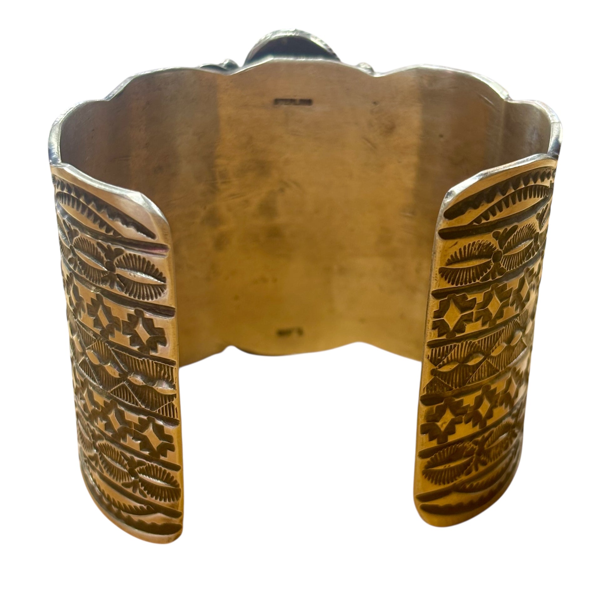 This handcrafted cuff by Navajo artist Tillie Jon is a stunning display of classic Southwestern artistry. At its center rests a vibrant turquoise stone, rich in matrix and color depth, framed by two glowing coral cabochons that add a warm, earthy contrast. The trio of stones is set in hand-tooled sterling silver, adorned with intricate stamp work, rope borders, and traditional silver drop detailing.