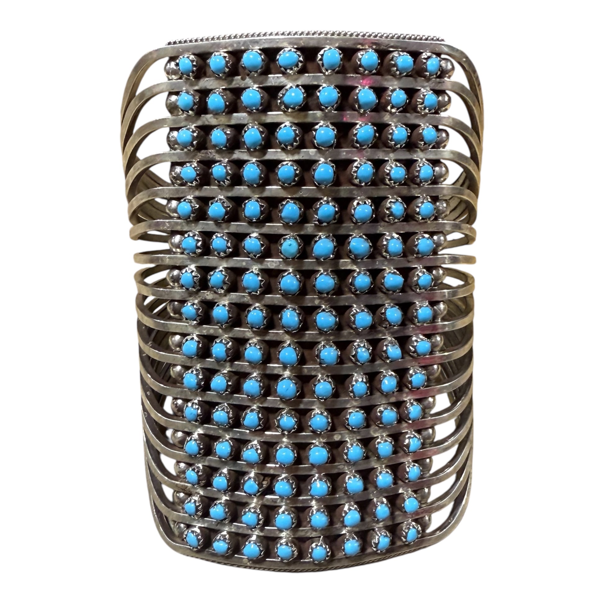 Bold, dramatic, and unmistakably Southwestern—this cuff makes a powerful statement. Featuring over a hundred hand-set turquoise cabochons, each bezel-set in sterling silver, the design fans out across multiple split shanks, creating a wide lattice-like structure that hugs the wrist with striking presence. This extraordinary piece is both a collector’s treasure and a wearable work of art.