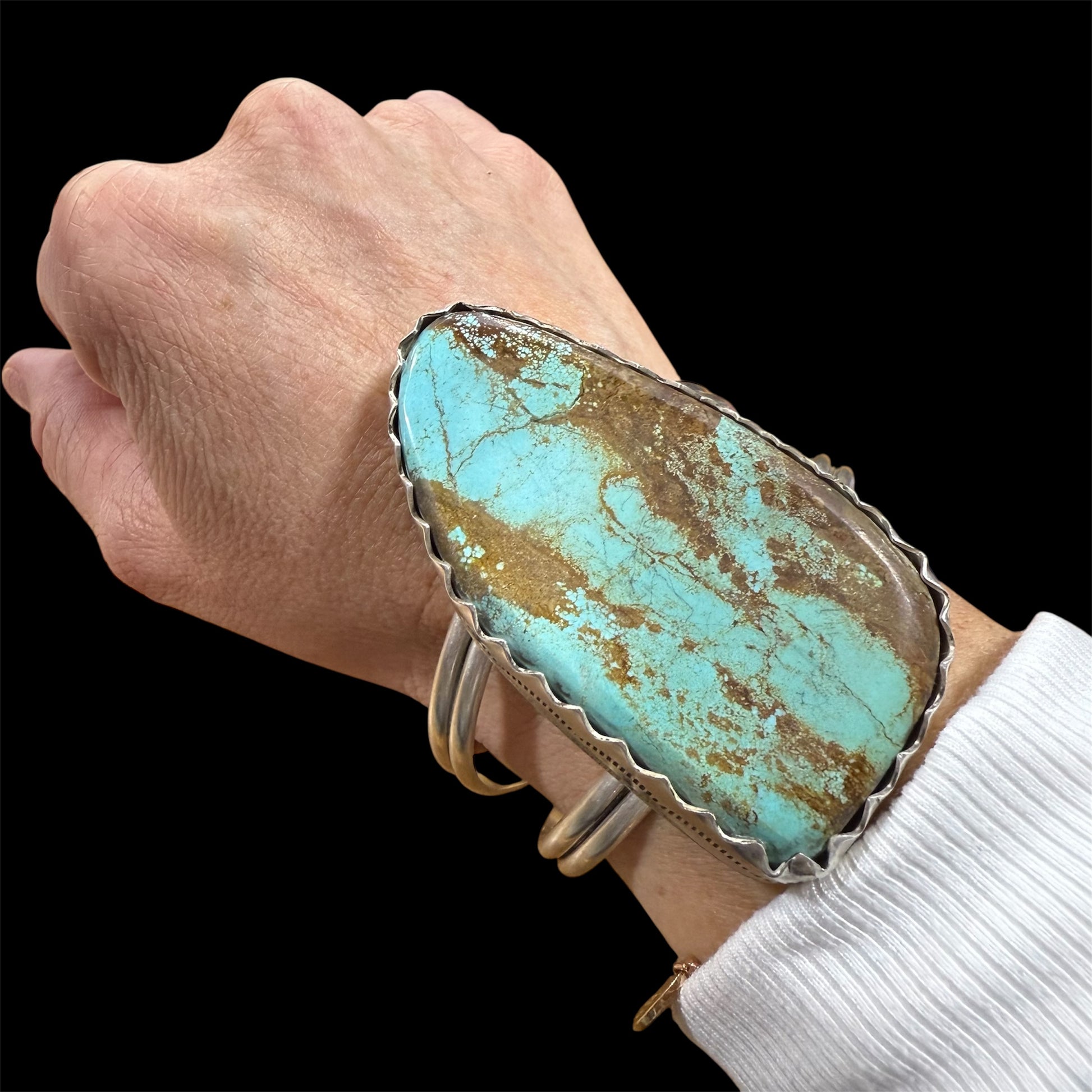 This remarkable cuff features a large freeform Royston turquoise stone, celebrated for its striking blend of vivid sky blue and rich golden-brown matrix. The stone’s natural patterning makes each piece truly one-of-a-kind, radiating the rugged beauty of the Nevada desert where Royston turquoise is mined.