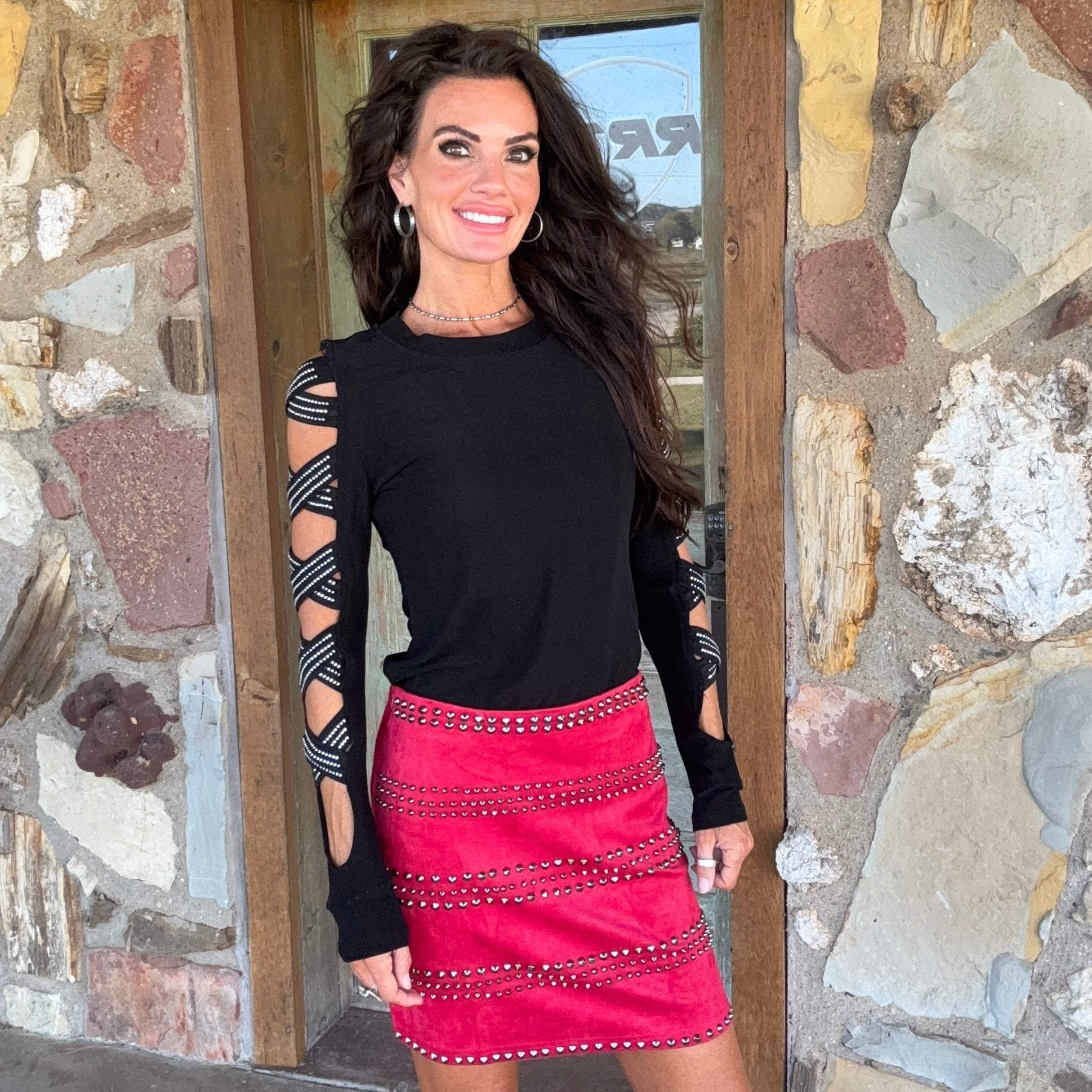Add a little rhinestone attitude to your everyday look with the Black Cutout Top. This Black knit features striking open-sleeve detailing, lined with rows of sparkling studs that catch every bit of light. Fitted with just the right amount of stretch, it’s equal parts comfortable and bold — perfect for pairing with denim, leather, or turquoise.