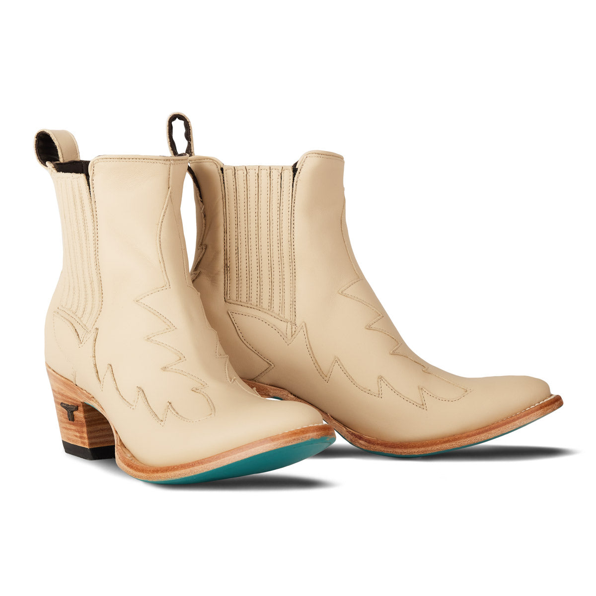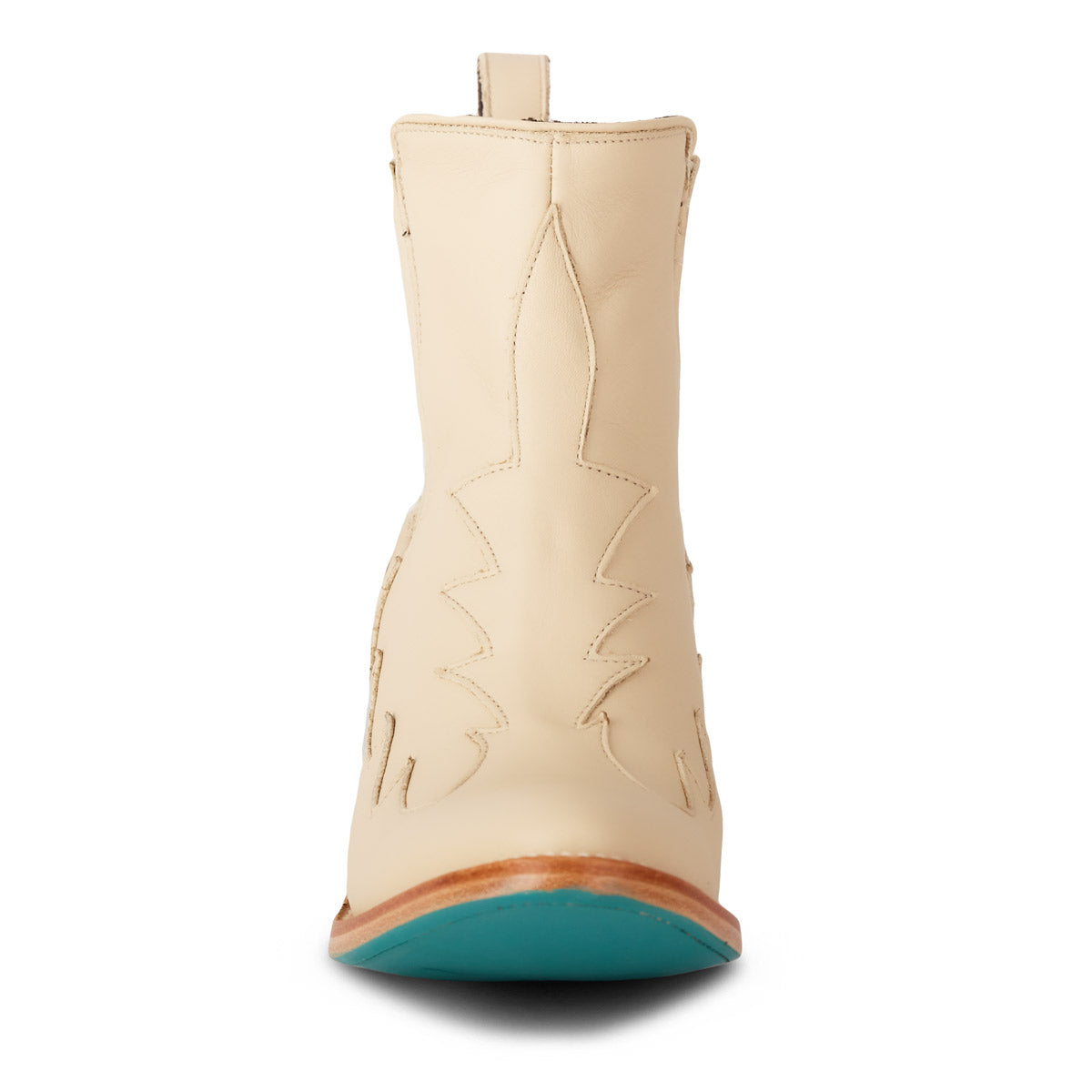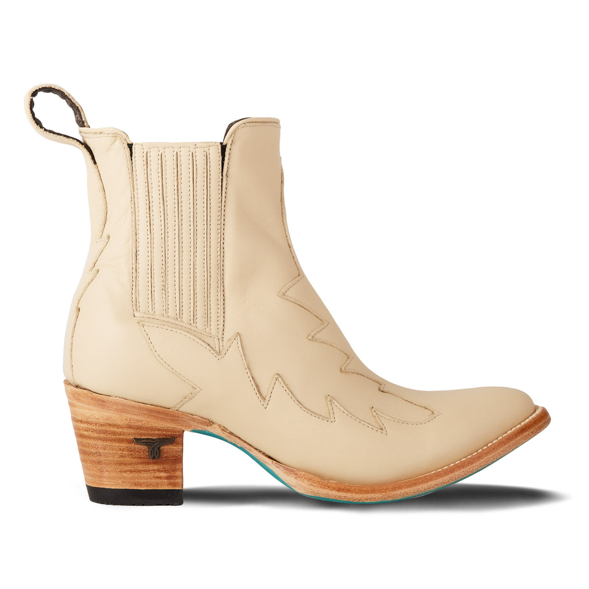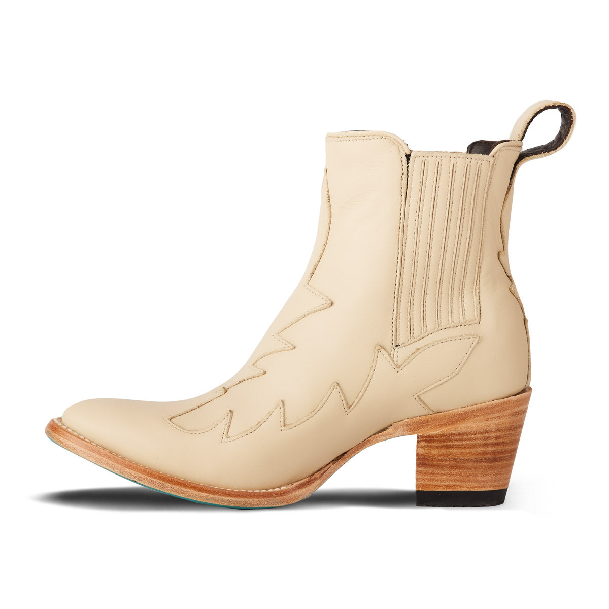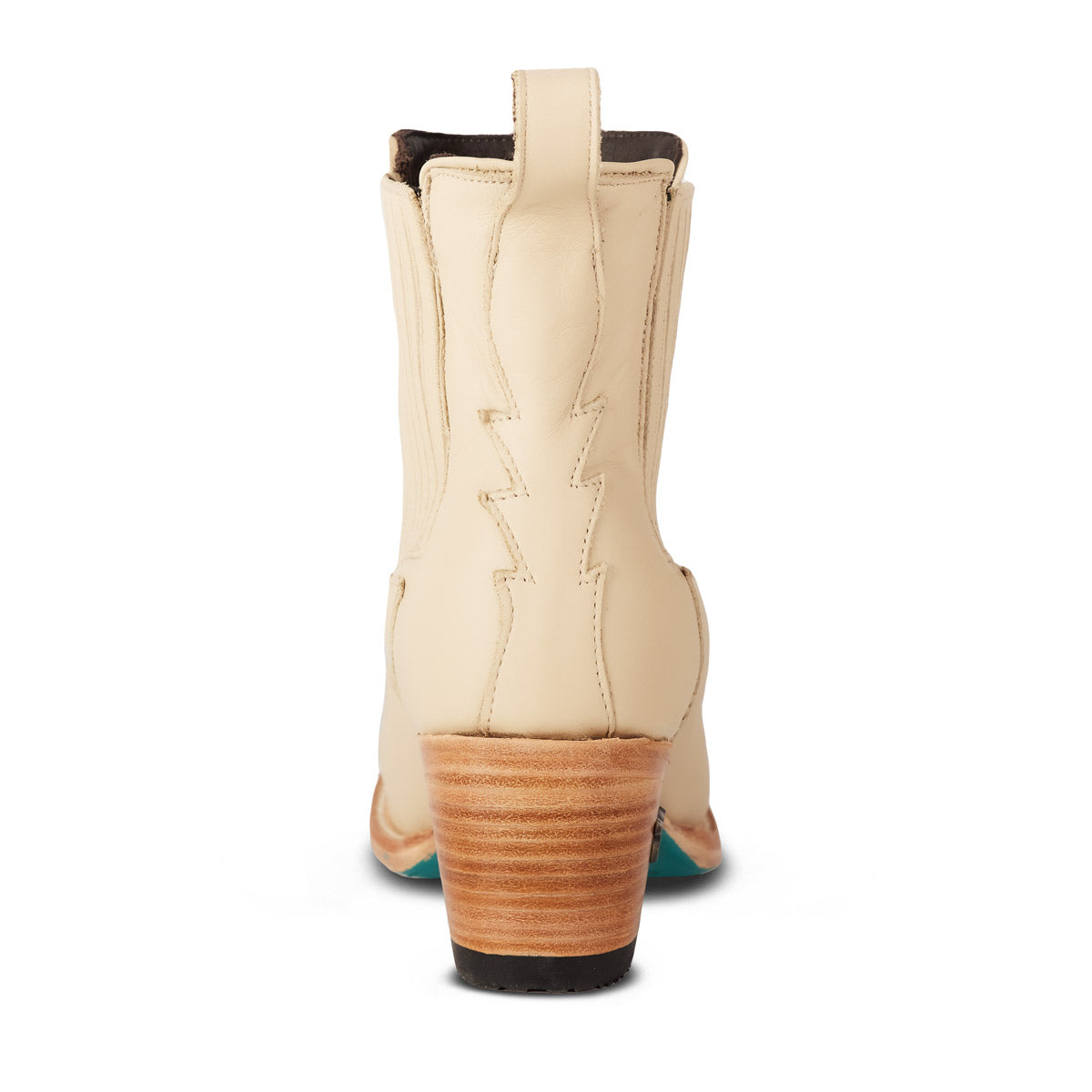 Breathe new life into a classic with this western-inspired Chelsea Bootie in Pale Ivory. Designed with a sleek, leather-covered elastic goring that frames the sidewall, this boot delivers effortless style and an ultra-flattering silhouette. The flame-stitched overlay motif brings an edge to the timeless Chelsea shape, with striking flame details running up the front and back—doubling as a pull tab for easy wear.
