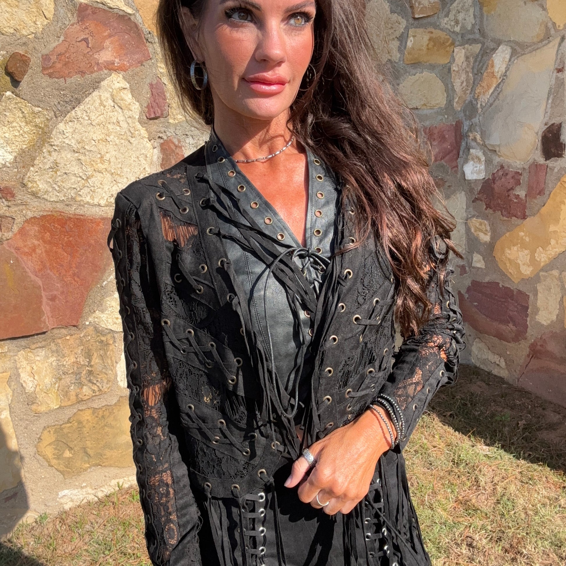 Command attention in the Whiskey and Lace Jacket, a sultry mix of lace, leather, and attitude. This statement piece features intricate lace panels, grommet-trimmed detailing, and lace-up accents throughout for a bold, high-fashion Western finish. The fitted silhouette and fringe-tie front add movement and drama, while the sheer sleeves bring just the right touch of femininity.