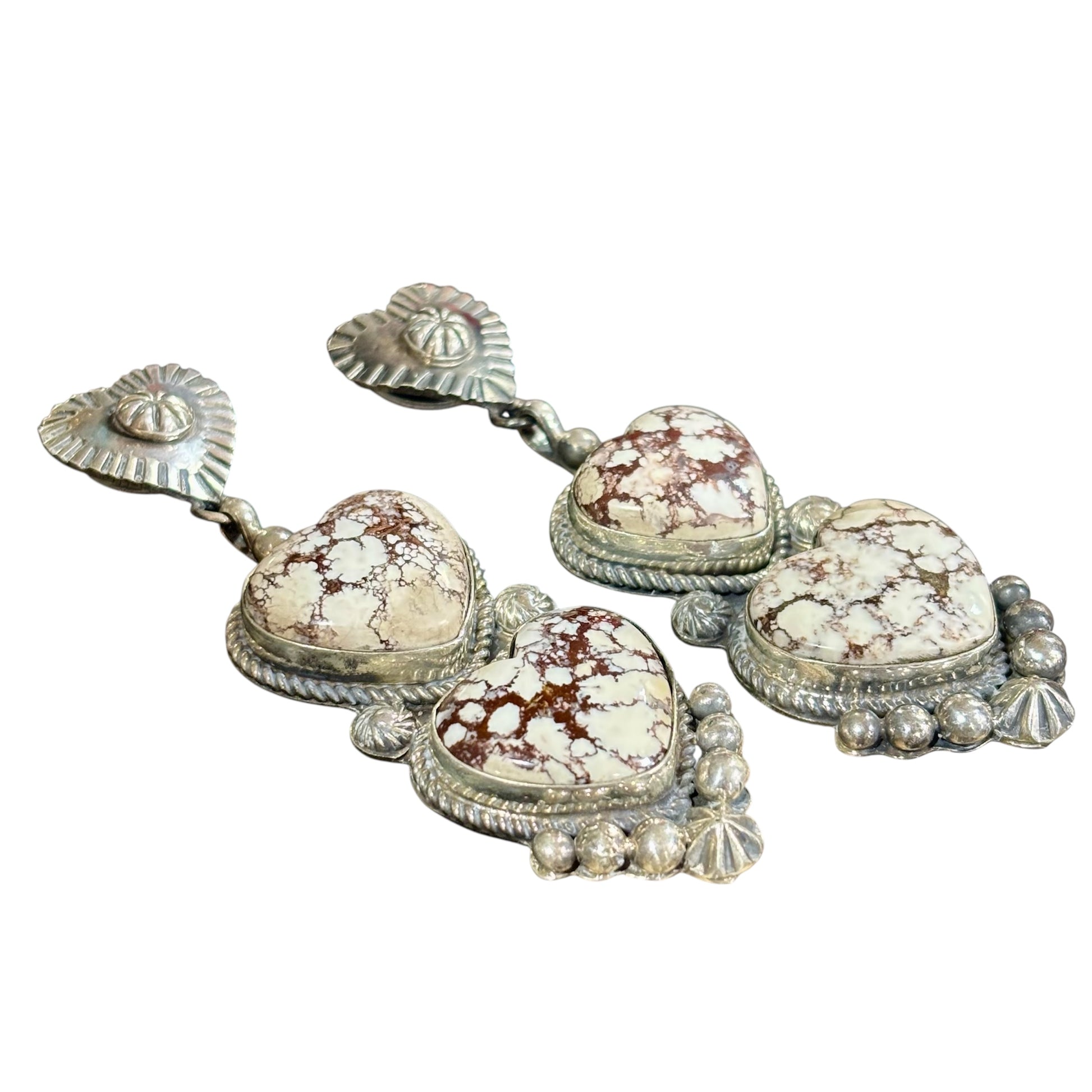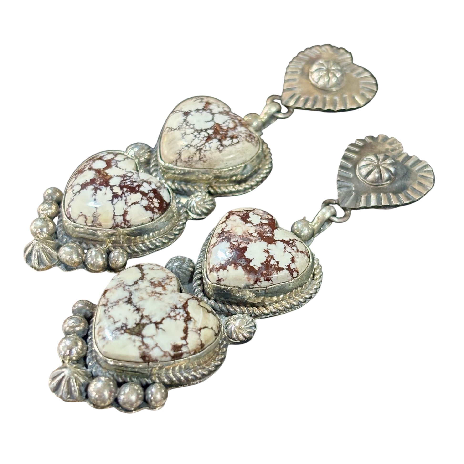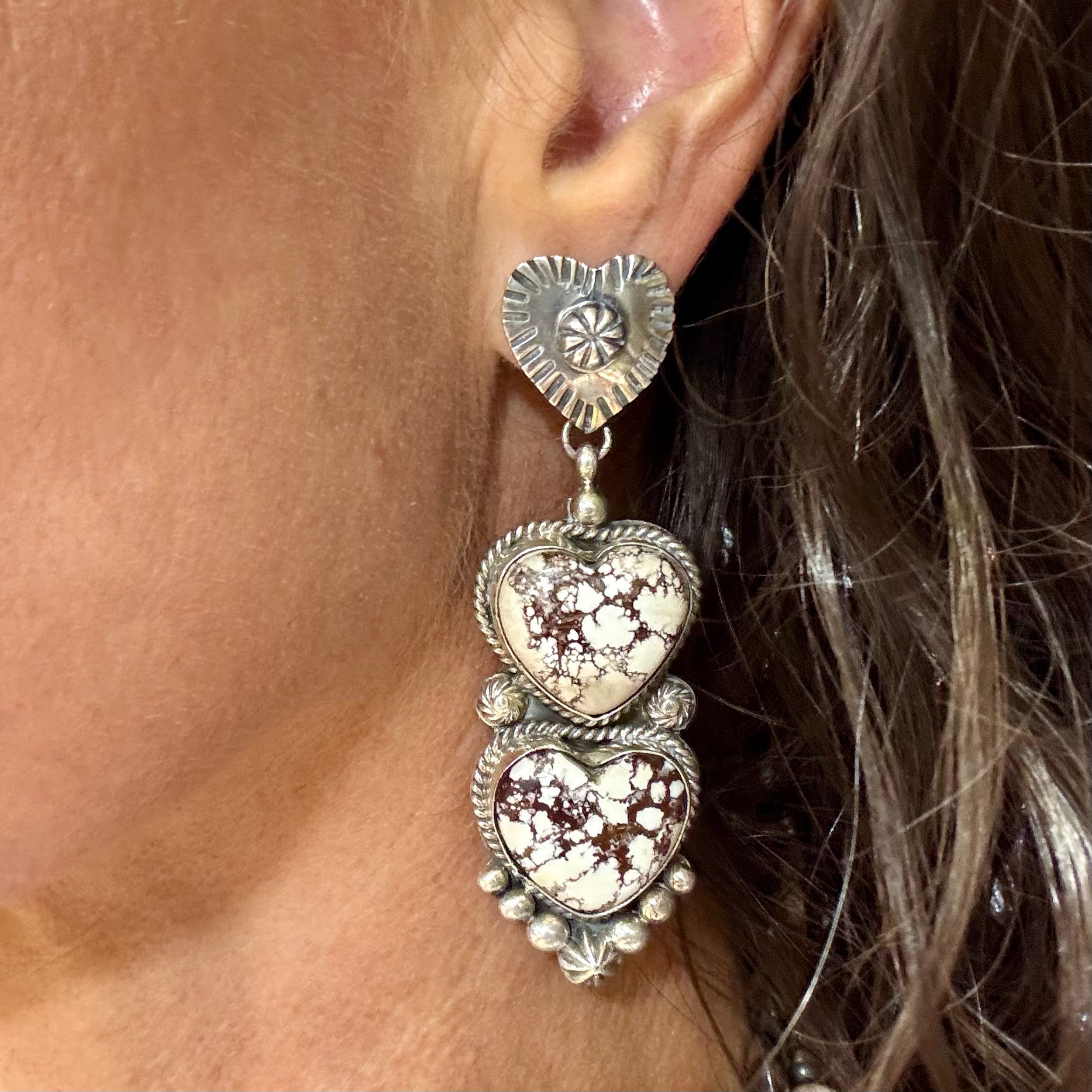 These White Buffalo earrings capture the perfect mix of romance and rustic soul. Handcrafted in sterling silver, each earring features two heart-shaped White Buffalo stones showcasing their natural marbled matrix of creamy ivory and chocolate brown. Detailed silver rope edging, starburst stamping, and raised bead accents give them that unmistakable Southwestern artistry. Finished with a heart-stamped post top, they’re statement-makers that tell a story of heritage, craftsmanship, and timeless Western beauty.