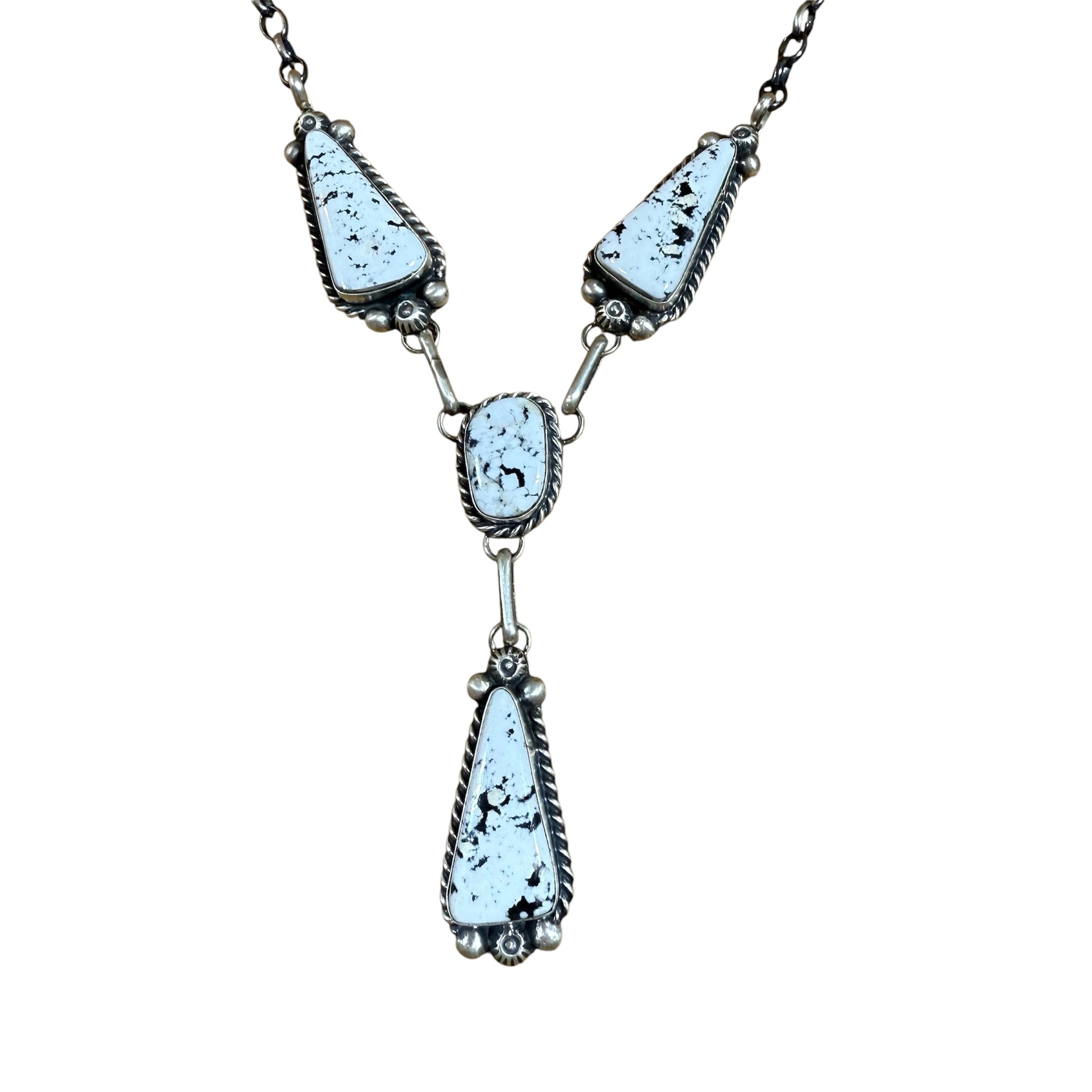 This stunning White Buffalo necklace and earring set is a true showcase of bold Southwestern elegance. Each stone is hand-cut and polished to reveal the signature white and black matrix pattern that makes White Buffalo so uniquely captivating. Set in sterling silver with classic Navajo-style rope and bead detailing, every piece balances modern sophistication with timeless tradition.