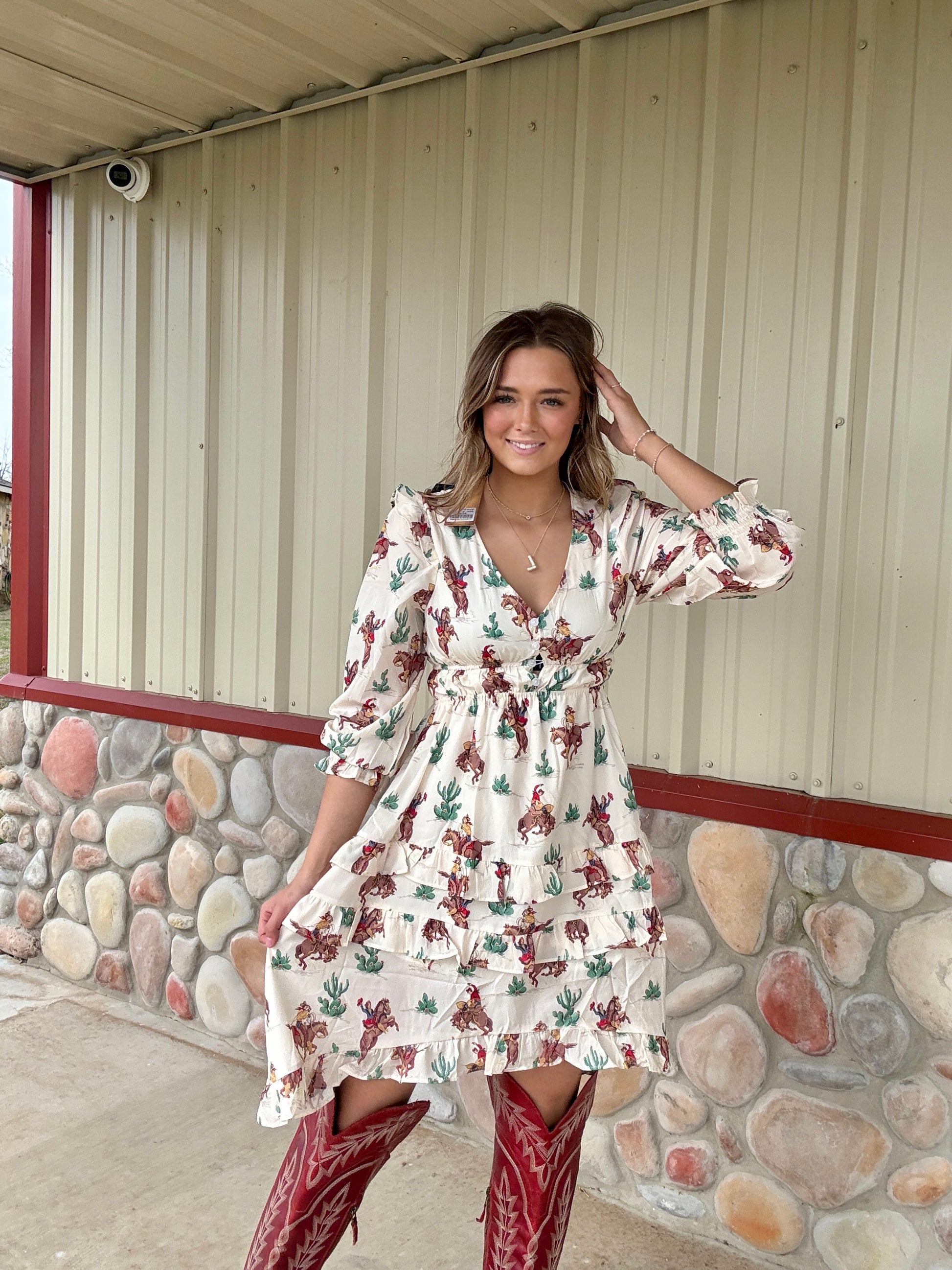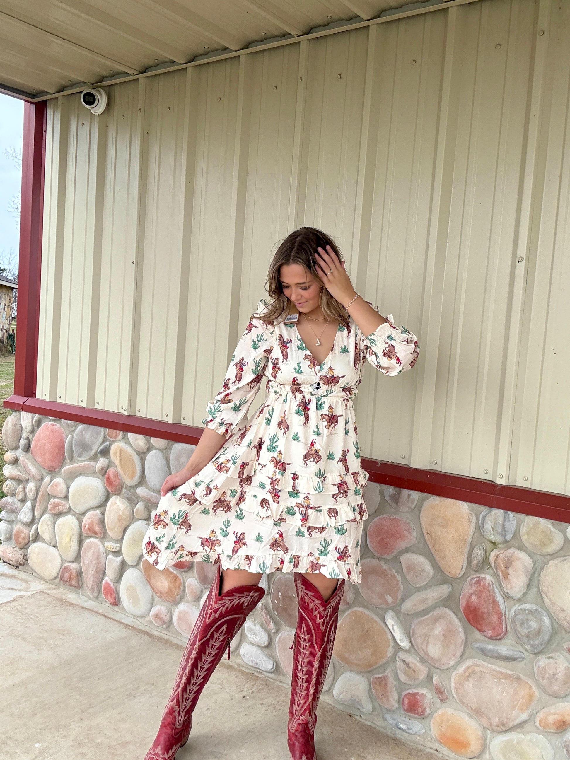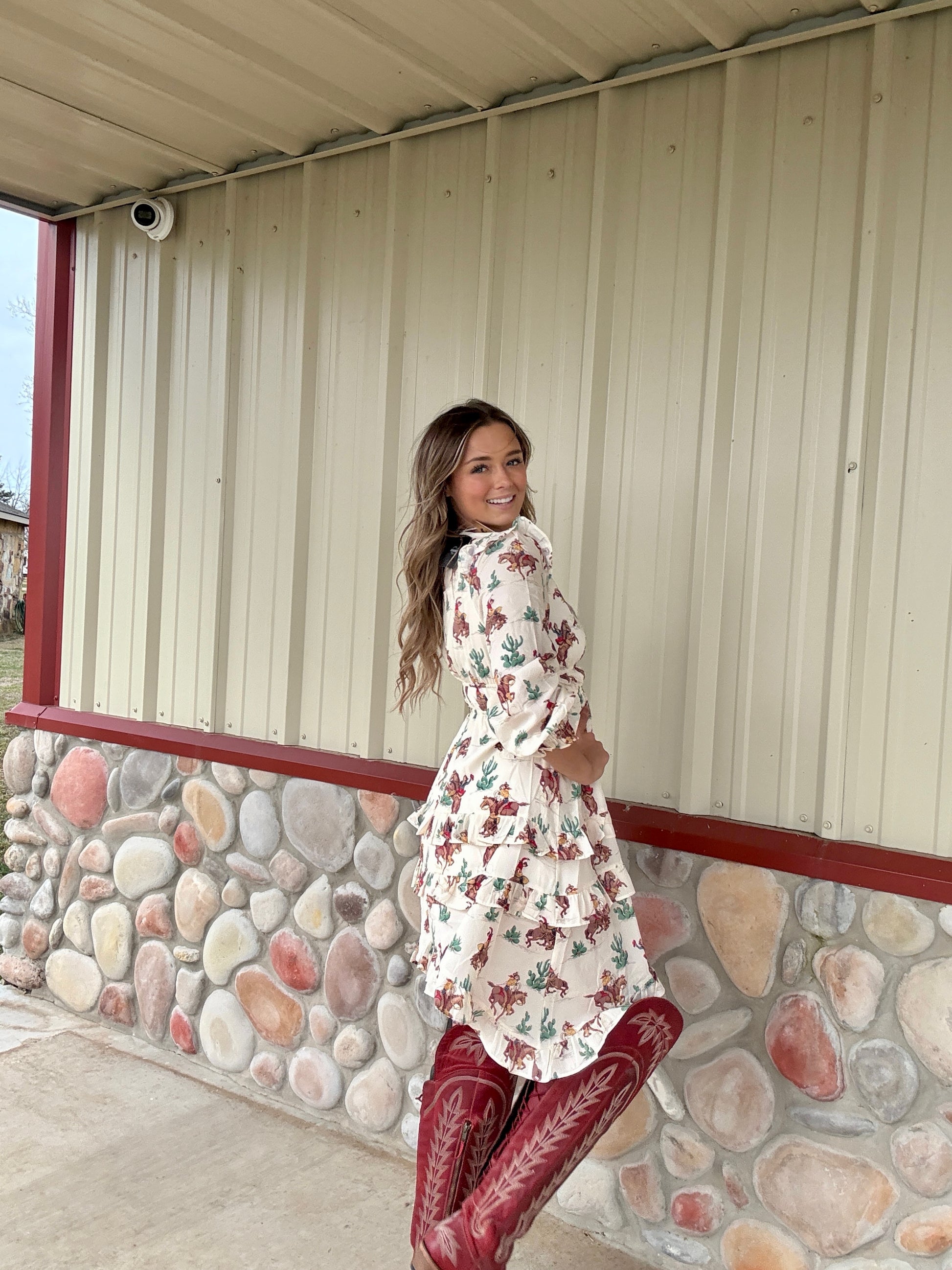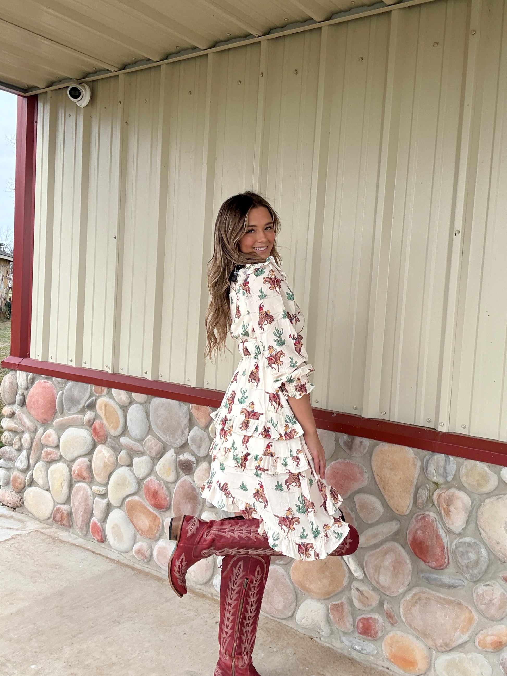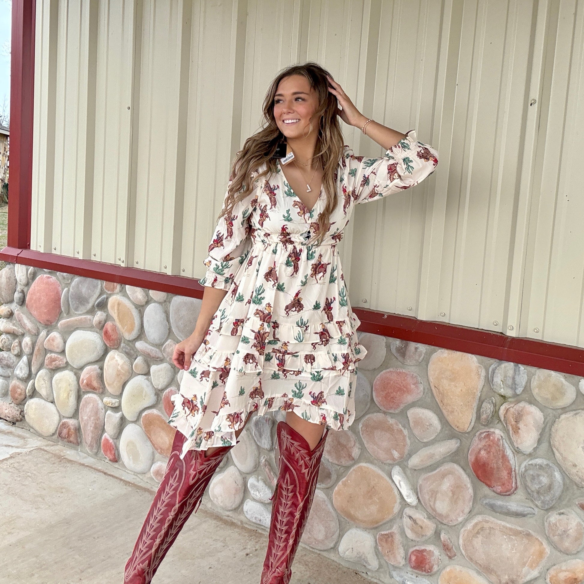 Say howdy to your new favorite twirl-worthy statement piece: the Yippee Ki-Yay Dress. With bucking broncos, blooming cactuses, and a whole lot of sass, this ultra-feminine western dress is made for wild hearts and starry nights.