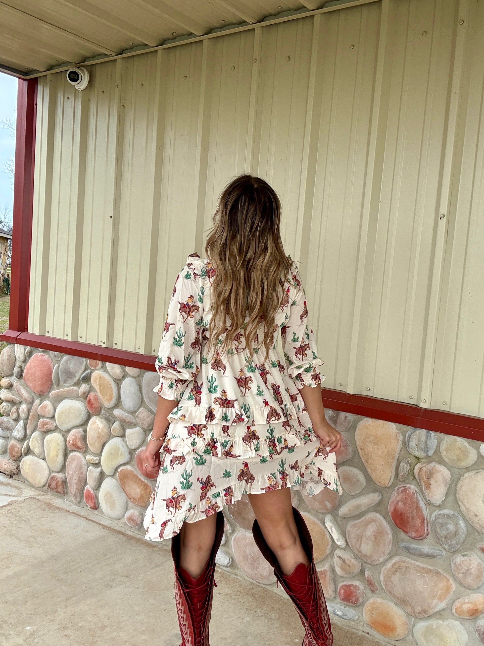 Delicate frilly accents along the sleeves and hem give it a soft, romantic edge, while the bold western print keeps it rooted in cowgirl spirit. Whether you're kicking up dust at the dancehall or just feeling yourself on a sunny day, this dress brings the yee and the haw.